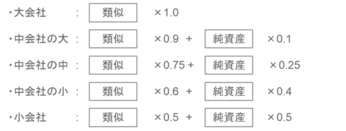 オーナー株主グループに属する方の株式評価については、上記の表の会社規模に基づき類似業種比準方式、純資産価額方式、もしくは類似業種比準方式と純資産方式の併用方式により評価します(従業員70人以上の会社は自動的に大会社になります)。会社規模ごとの計算式は下記の通りであり、下記計算式により計算した金額と純資産価額方式により計算した金額とのいずれか低い方が評価額となります。