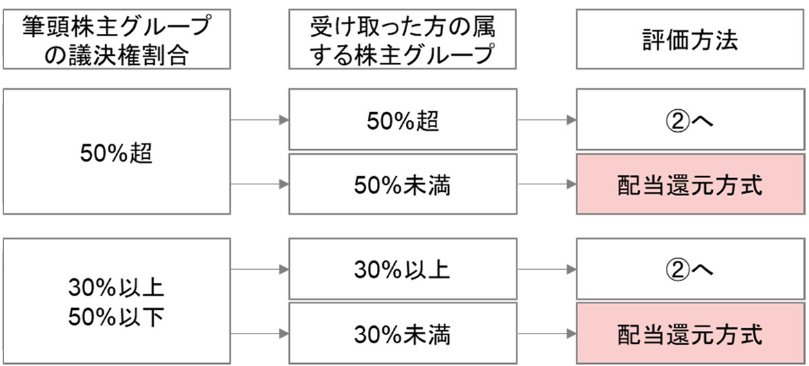 少数株主の方は株主として会社に与える影響力が少ないため安い評価(=配当還元方式)、オーナー株主グループに属する方は会社への影響力が高いため高い評価(=類似業種比準方式・純資産価額方式)になるというイメージです。 *イメージを持っていただくため簡便的な記載を行っています。実際の評価方法の判定にあたっては、より詳細に検証する必要あります。